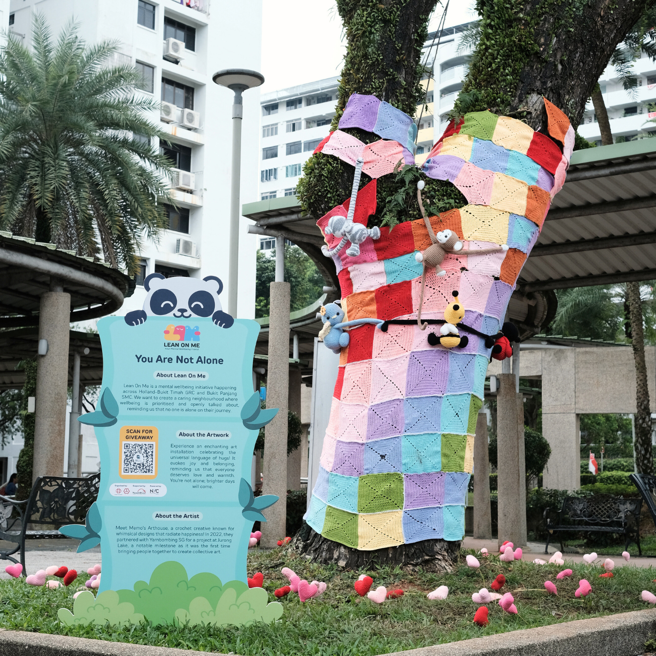 Our installation at Ghim Moh Market, was titled "You are not alone". It features a giant tree hugger as well as many hearts on the ground, reminding everyone that they all deserve a hug and that they are never truly alone in what they might be going through.
